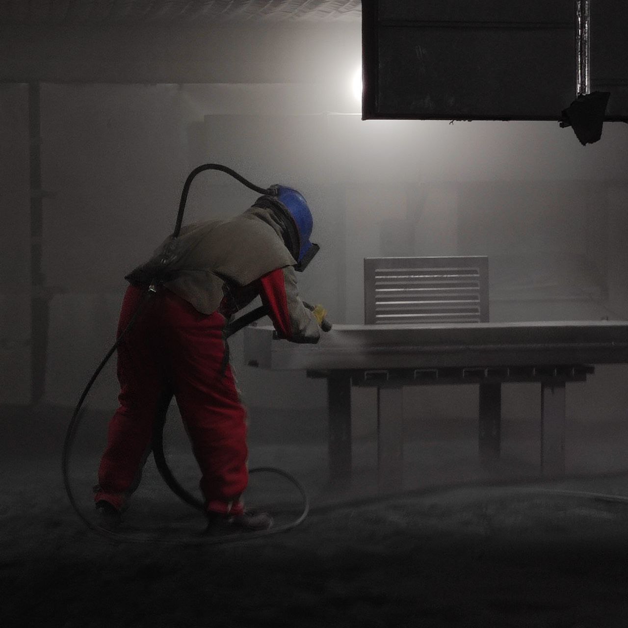 Для забезпечення високої адгезії фарби до металу ми використовуємо методи абразивної очистки: піскоструминну та дробеструминну обробку. Ці процеси дозволяють ефективно видаляти окалину, іржу, старі покриття та забруднення, залишаючи однорідну шорстку поверхню, готову до нанесення покриттів.